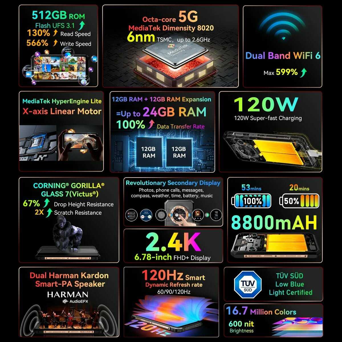 ударопрочный корпус, FM-радио, фонарик, датчик приближения, гироскоп, компас, датчик освещенности, акселерометр, барометр