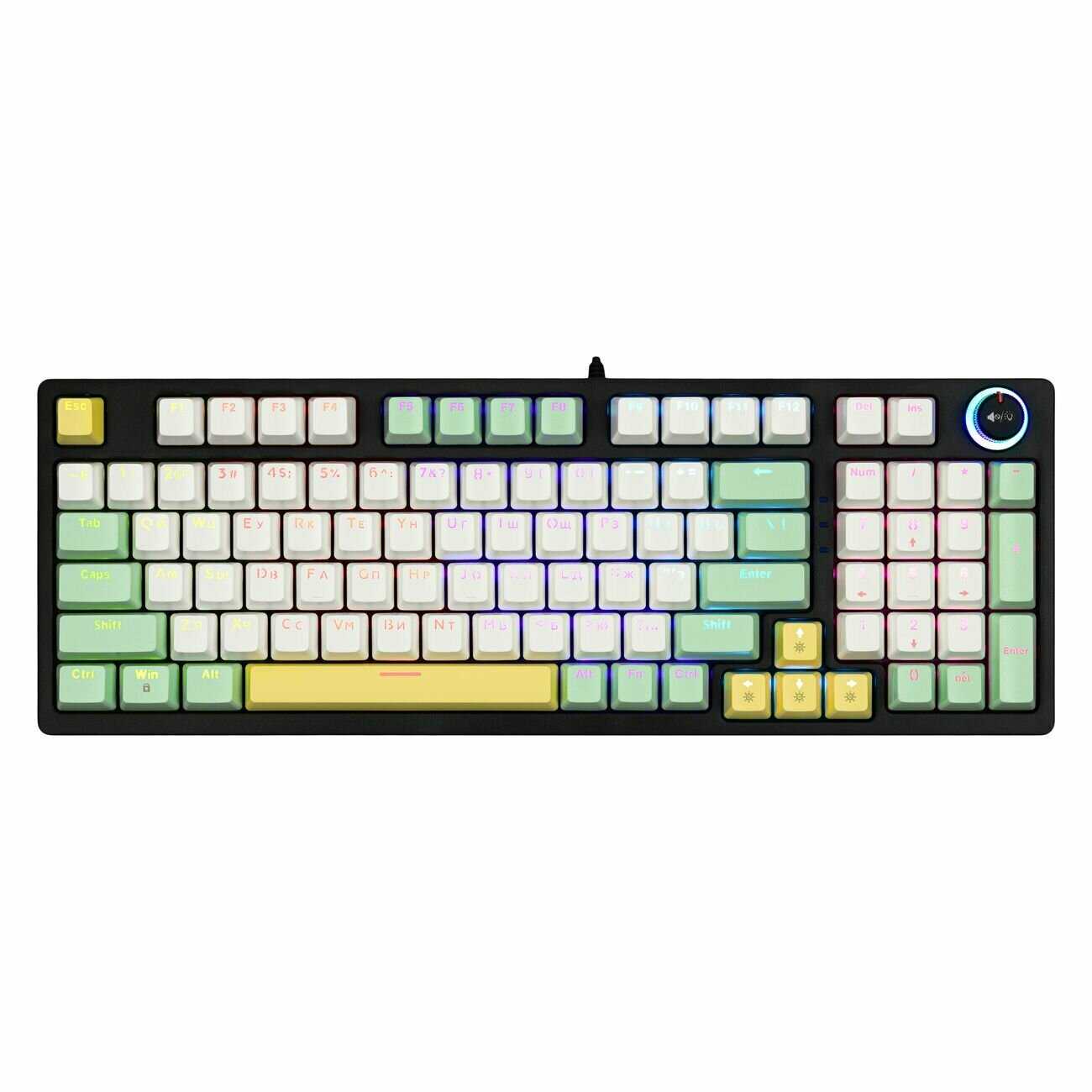 - + Удобная крутилка громкости. Звук набора коричневых свичей тихий (но не сильно тише хороших красных), ход клавиш относительно мягкий. Подсветка, хоть и для любителей того самого, глаза не жжёт, и русские буквы видны хорошо. Более того, и без подсветки русские буквы видны на белых клавишах, это очень хорошо, на серых например без подсветки не видно ни-че-го. Крепко держится на столе. Кейкапы снимаются. Гарантия.