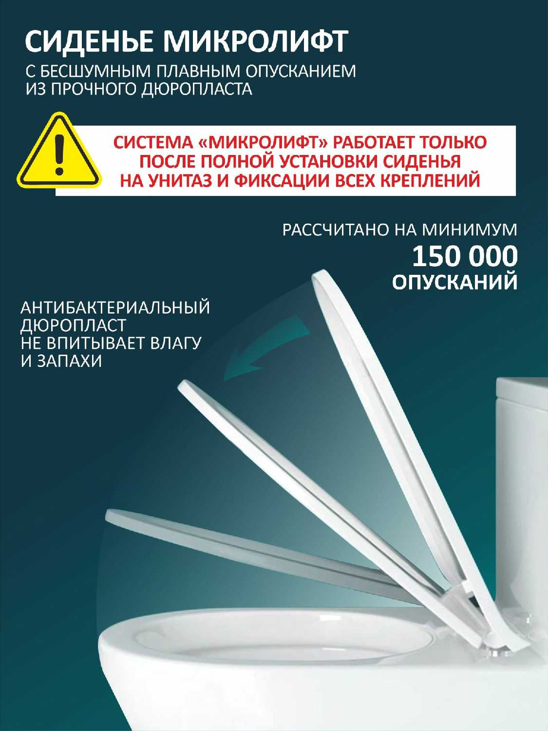- + Удобный, белоснежный. возможность выбора интенсивности слива. Отсутствие бесячего ободка. Сиденье с мультилифтом максимально удобная опция. Оно так же легко снимается для мытья.
