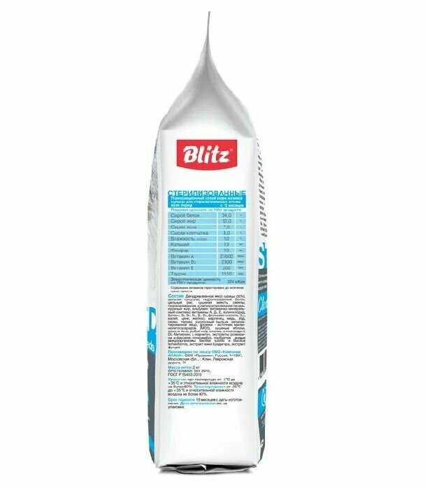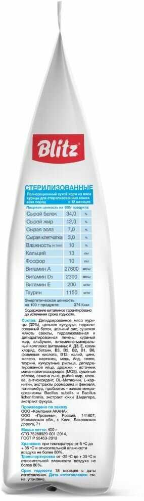 Сравнение с аналогами и уникальные аспекты: Blitz выгодно отличается от бюджетных кормов (типа "Мираторг") стабильным качеством, отсутствием побочных эффектов в виде рвоты или отказа от еды и видимым улучшением состояния шерсти. Его состав, включающий натуральные мясные компоненты и пробиотики, сравнивают с премиальными брендами, но по более доступной цене. Уникальная черта — форма гранул, повышающая удобство поедания для определенных групп животных. Главные минусы на фоне конкурентов — отсутствие ZIP-замка и редкие, но возможные проблемы с запахом или целостностью упаковки при транспортировке.