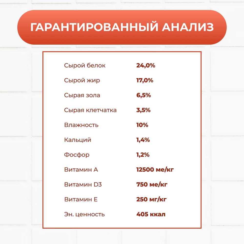 - Норма кормления на 10-15% ниже аналогов за счёт высокой питательности и усвояемости компонентов.