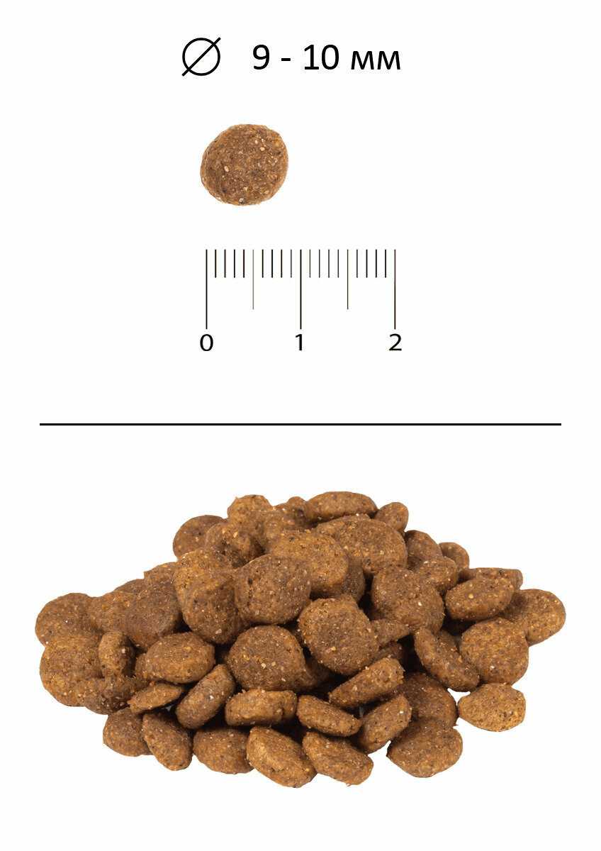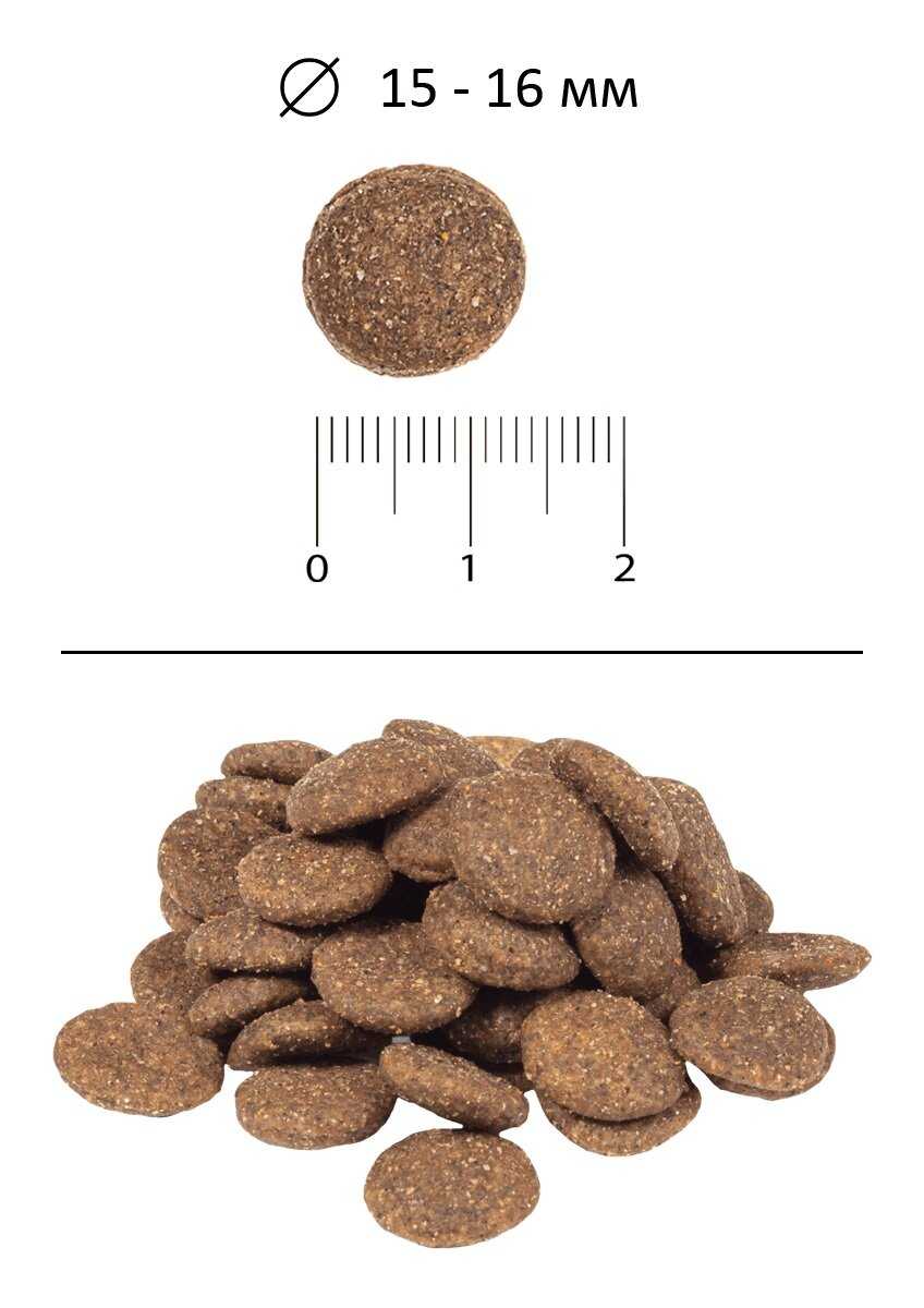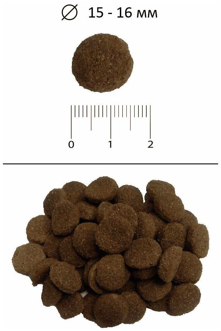 Гранулы характеризуются как крупные (для средних и больших пород – немецкие овчарки, лабрадоры, кане-корсо), но при этом легко разгрызаются даже мелкими собаками (карликовый пинчер, щенки дворняжек). Это оптимально для профилактики заглатывания без пережевывания, но может не подойти миниатюрным породам из-за структуры. -