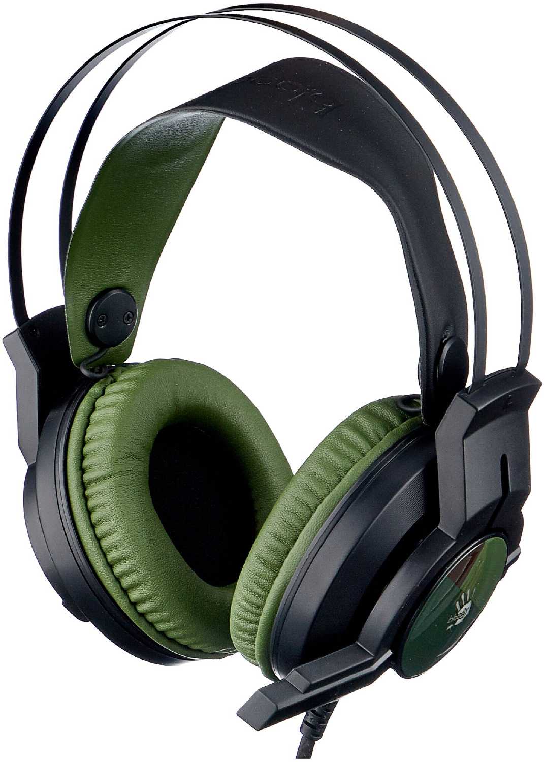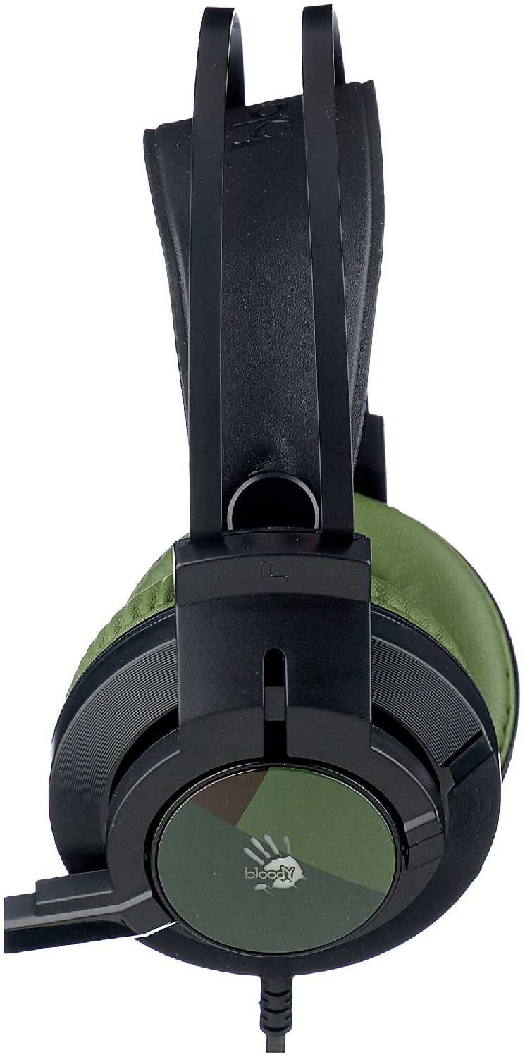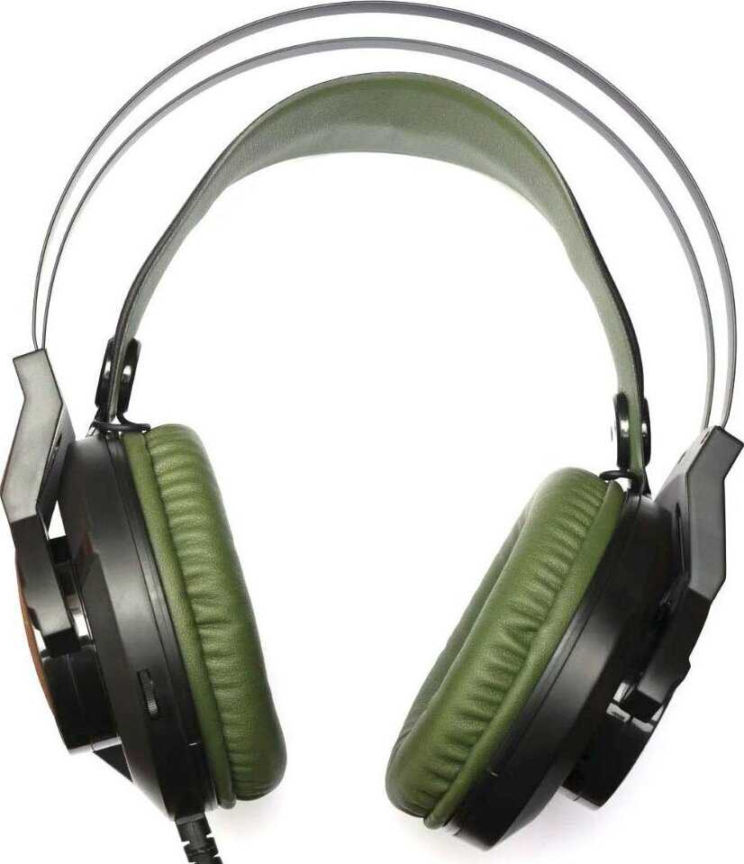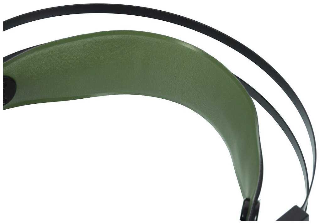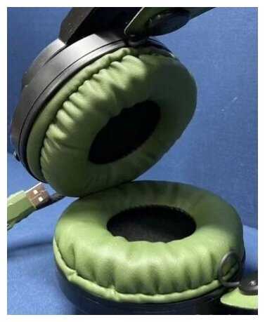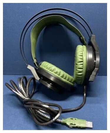 Кабель отличный, не скручивается и даже не трётся, его крайне трудно случайно сломать/порвать, а целенаправленно - с помощью очень острого ножа/ножниц. На конце USB A, который покрашен в приятный зеленый цвет. Сами наушники выполнены в стиле "милитари" - камуфляжная основа подсветки + зеленый цвет амбюшур и ободка из кожи (цвет характерный для военной техники, я не знаю как правильнее описать)