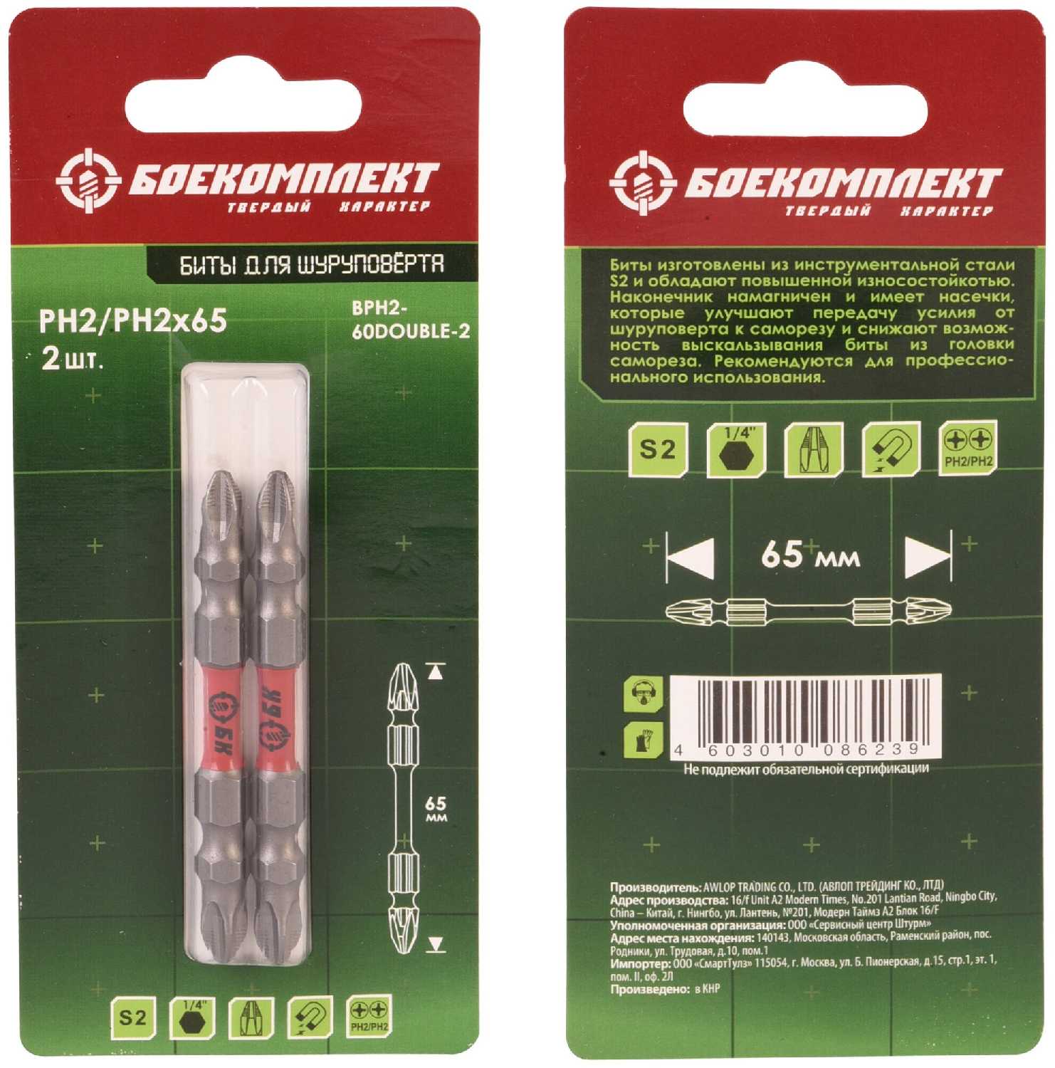Характеристи Боекомплект Бита двухсторон (BPH2PZ2-60DOUBLE-2)