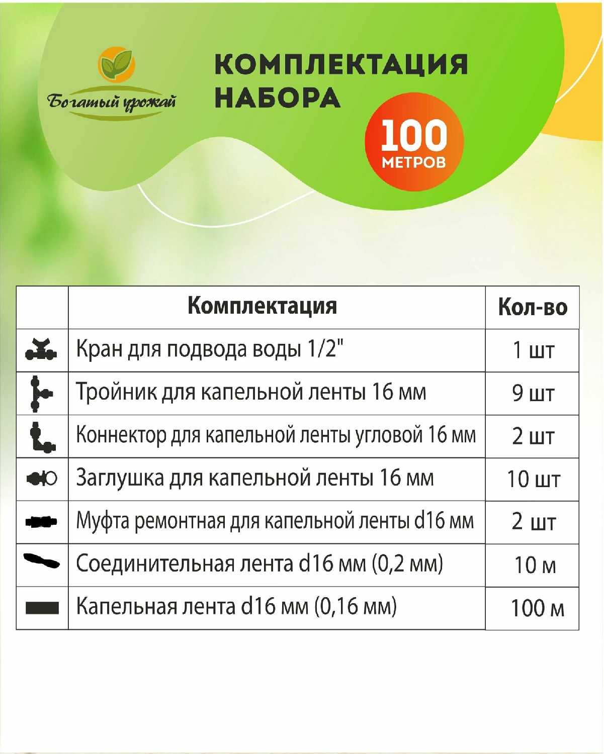 Комплектация : | Капельная лента - 100 метров, шаг капельниц - 30 см / Соединительная лента - 10 метров / Кран для подвода воды- 1 шт / Тройник для капельной ленты - 9 шт / Угловой коннектор для капельной ленты - 2 шт / Муфта ремонтная для капельной ленты - 2 шт / Заглушка для капельной ленты - 10 шт. |