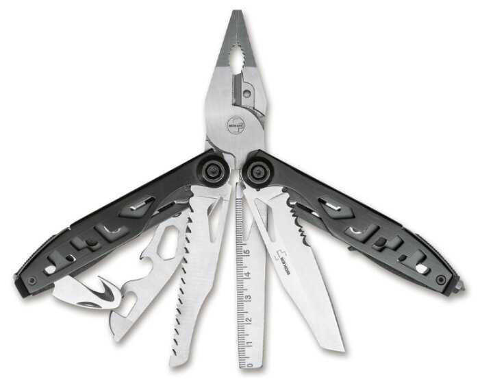 | Инструменты (функции) : | винтовая отвёртка, гаечный ключ, консервный нож, кусачки, линейка, напильник, нож, отвертка, открывалка для бутылок, пассатижи, пила, стеклобой |