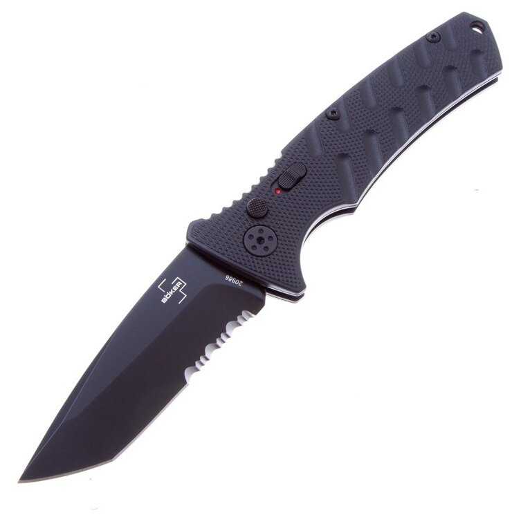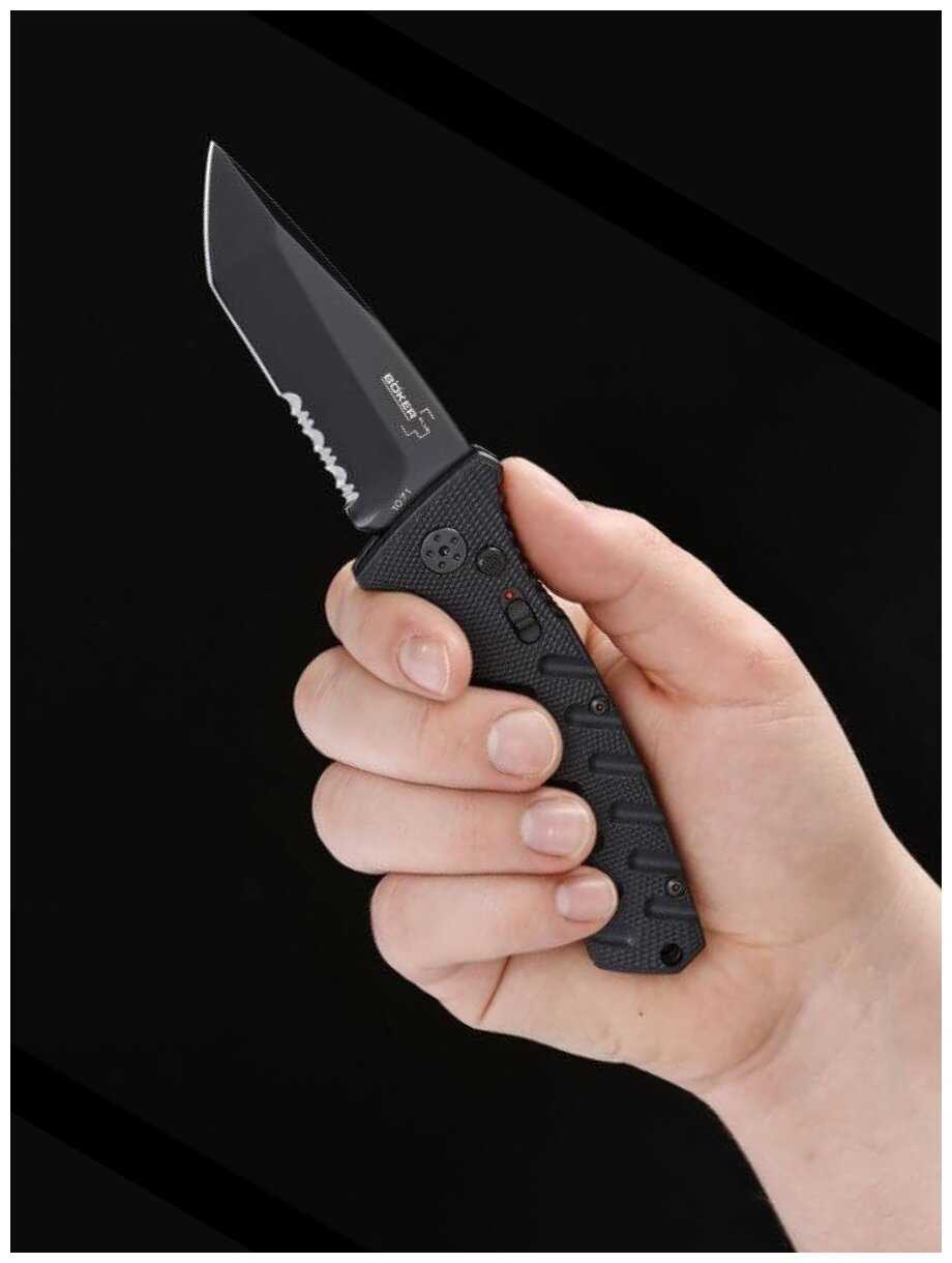 | Особенности : | автоматический выброс клинка, клипса для кармана, серрейторная заточка |