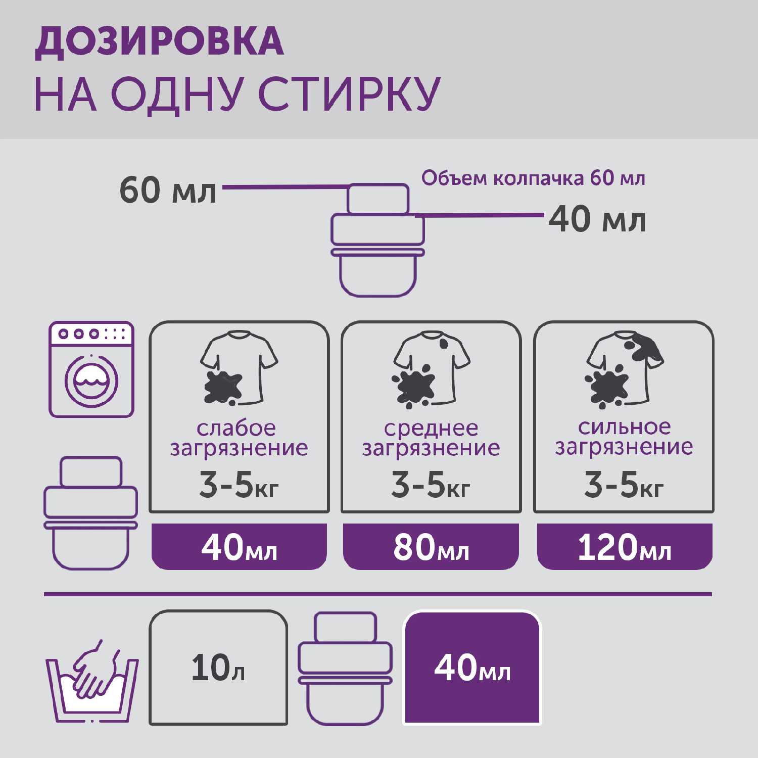 Способ применения : | Объем колпачка 60мл. Машинная стирка (на 3-5кг белья): слабое загрязнение - 40мл, среднее загрязнение - 80мл, сильное загрязнение - 120мл. Ручная стирка: добавьте 40мл геля на 10 литров воды |