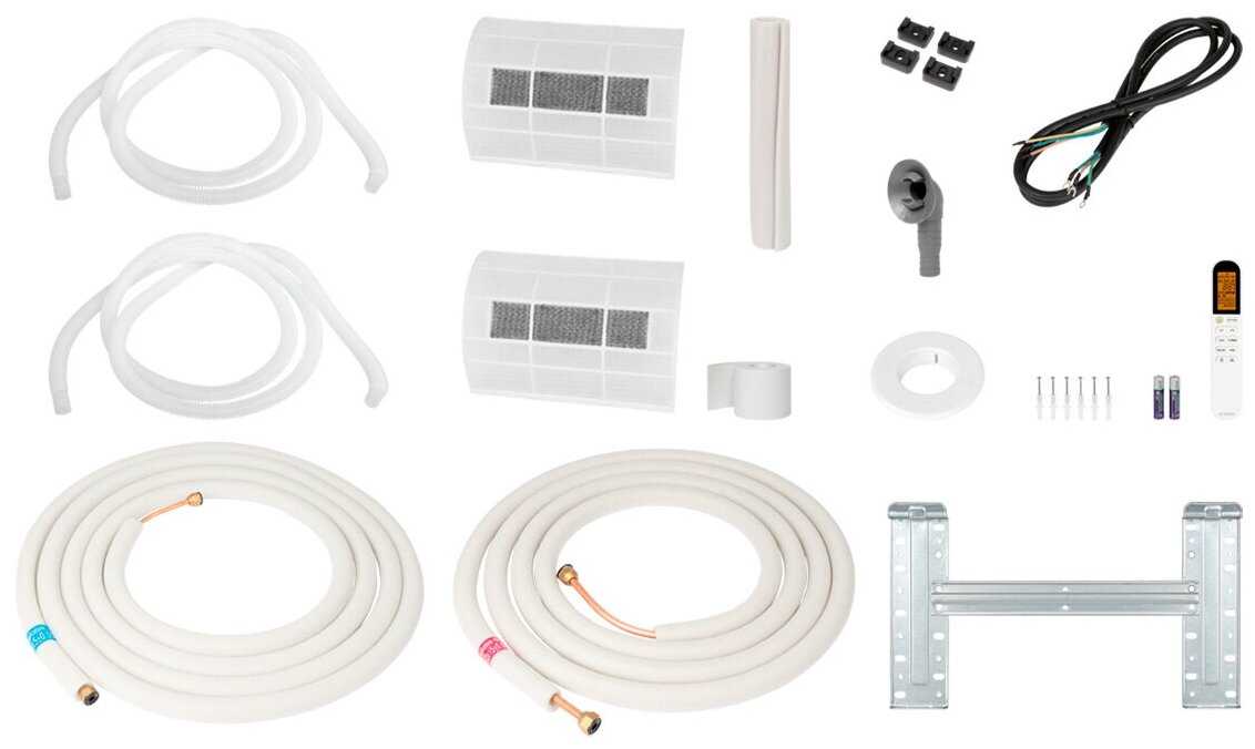 | Подробная комплектация : | 1 наружный блок, 1 внутренний блок, 5 м трубки, 1, 5 м сетевого кабеля, Пульт ДУ, виниловая лента, перфорированная крышка, шланг для отвода конденсата, крепление для внутреннего блока. |