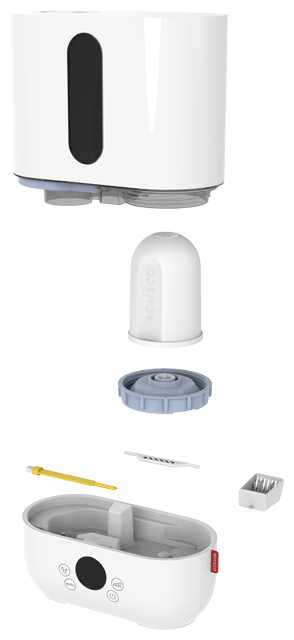 - Съемный бак на 3,5 л с ручкой для удобного долива, уровень воды видно, расход умеренный — хватает на сутки в авторежиме.