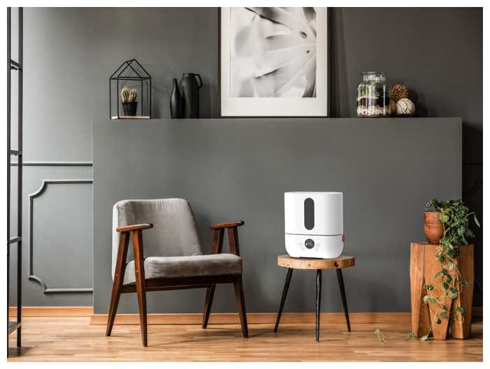 - Встроенный гигрометр и гигростат точно поддерживают заданный уровень, без скачков, что улучшает комфорт дыхания и снижает сухость воздуха.