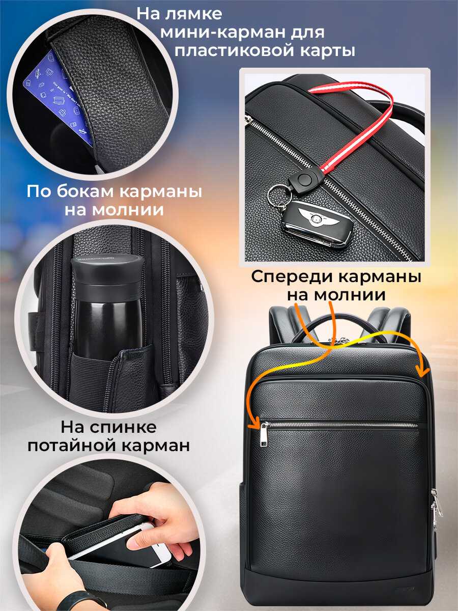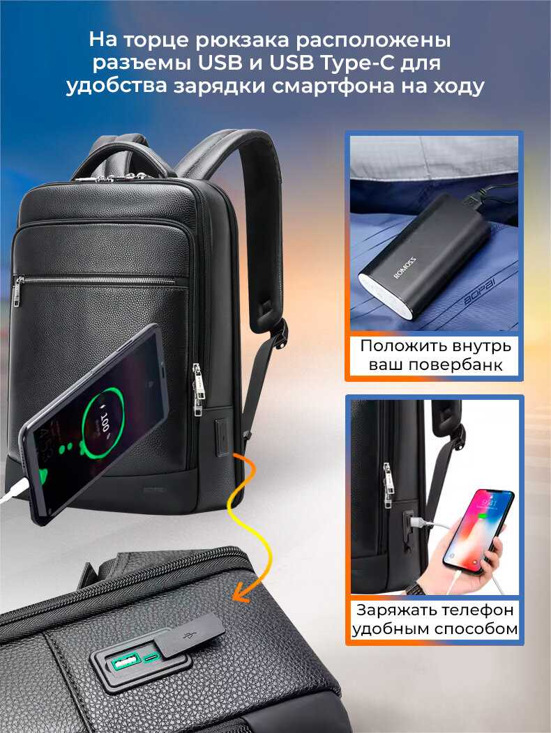 - Много карманов внутри. - - - Довольно бесполезный модуль с юзб, потому что через него теряется функция быстрой зарядки в пауэр банке.