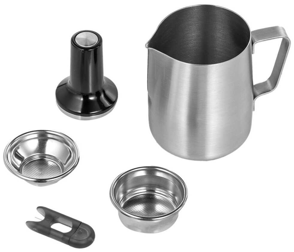 комплектация: кофеварка: 1 шт., портафильтр: 1 шт., питчер для молока: 1 шт., фильтры с двойным дном на 1 и 2 чашки: 1 пара, инструмент для чистки: 1 шт., темпер: 1 шт., руководство пользователя: 1 шт