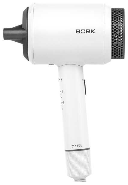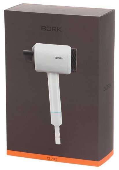 - + Приобретала фен Bork F780. Привлекла сама фирма и вид фена (очень нестандартный). Великолепно упакован, удобный плоский чехол с молнией (вмещается в ящик под раковиной)+ сам фен и одна насадка (щетка для волос). Мне и надо был минимум. Не скажу, что сушит мгновенно, но не долго. Регулируемый режим, мне понравился прохладный воздух вкупе с щеткой-насадкой для волос. Если смотреть цена + качества между Дайсоном и Борком, Борк великолепен.