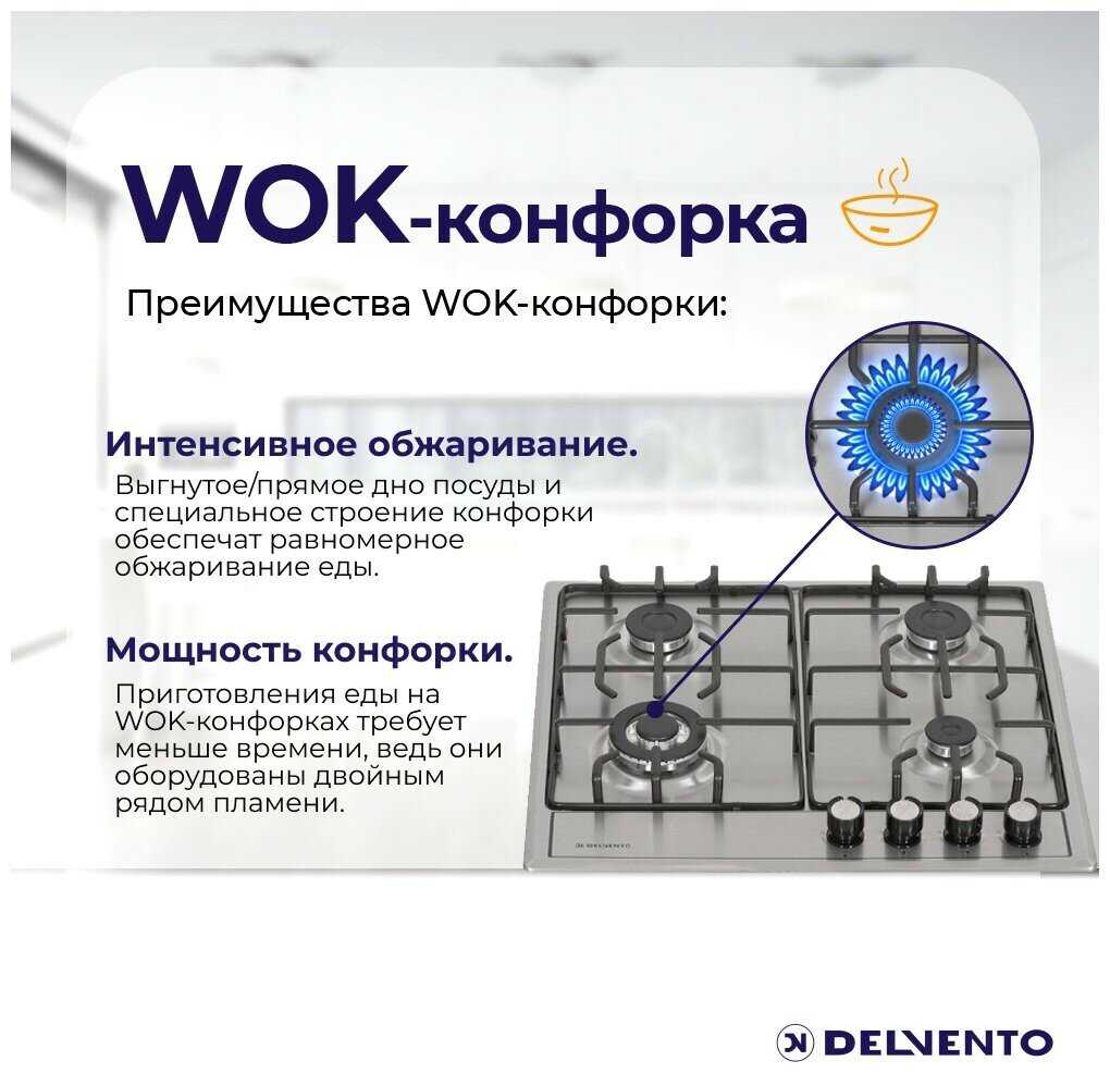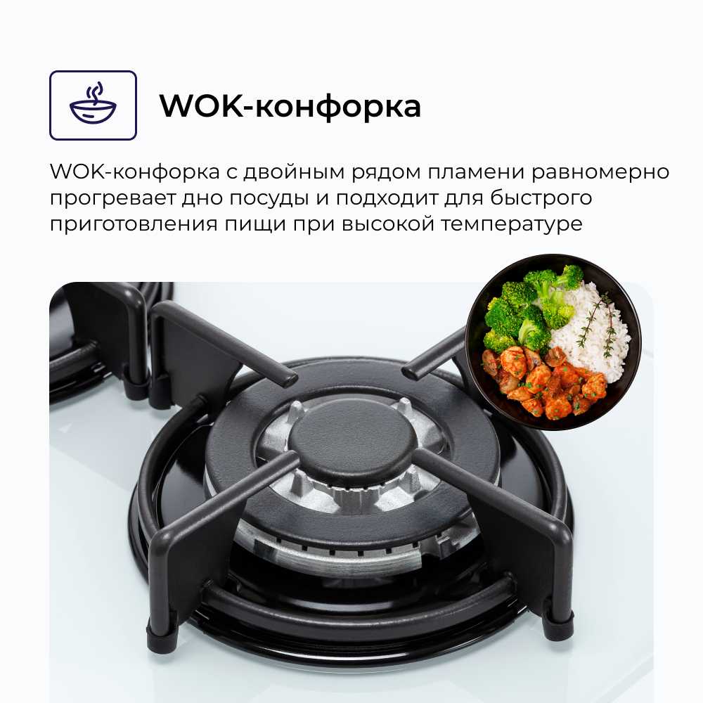 - WOK-конфорка на 2 кВт обеспечивает равномерный разогрев большой посуды, сокращая время приготовления блюд вроде супов или жарки.