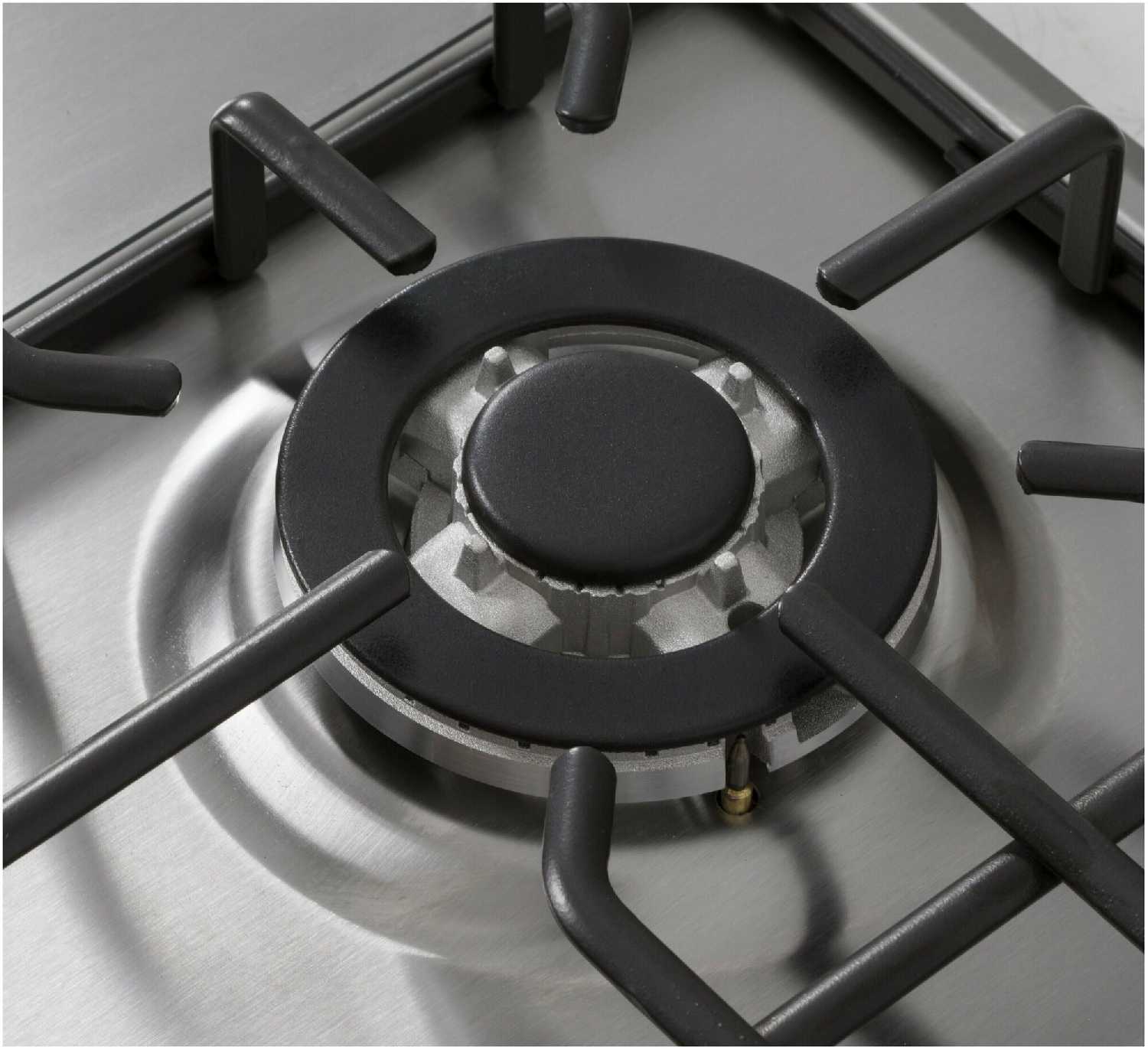 - Равномерное распределение пламени по поверхности конфорок предотвращает локальный перегрев, повышая качество приготовления и безопасность.