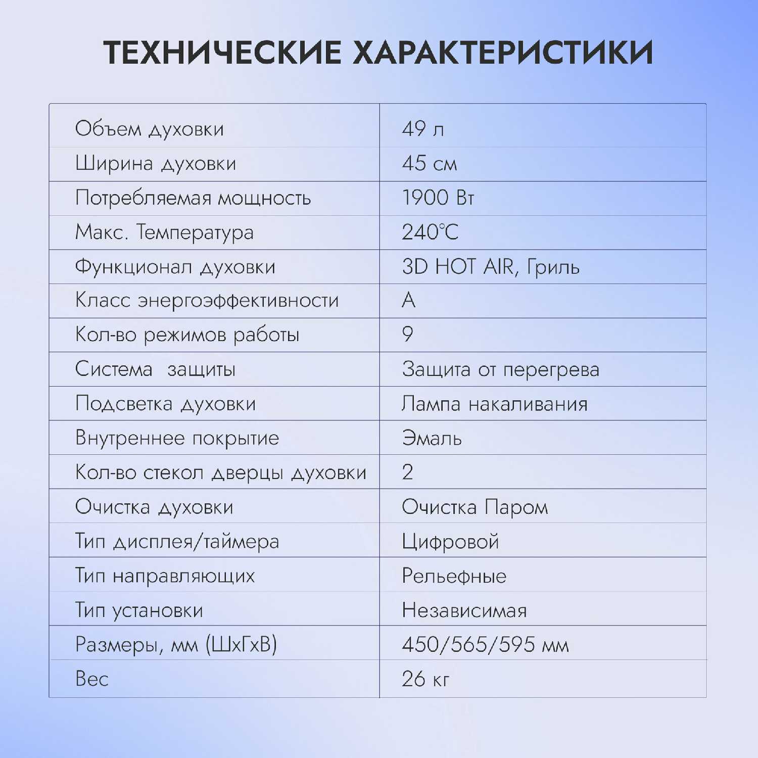 Также хочется отметить его простоту в использовании. Управление духовкой интуитивно понятное, все настройки и режимы легко доступны. Имеется хорошая подсветка, что удобно при приготовлении темных блюд или при проверке готовности пищи.