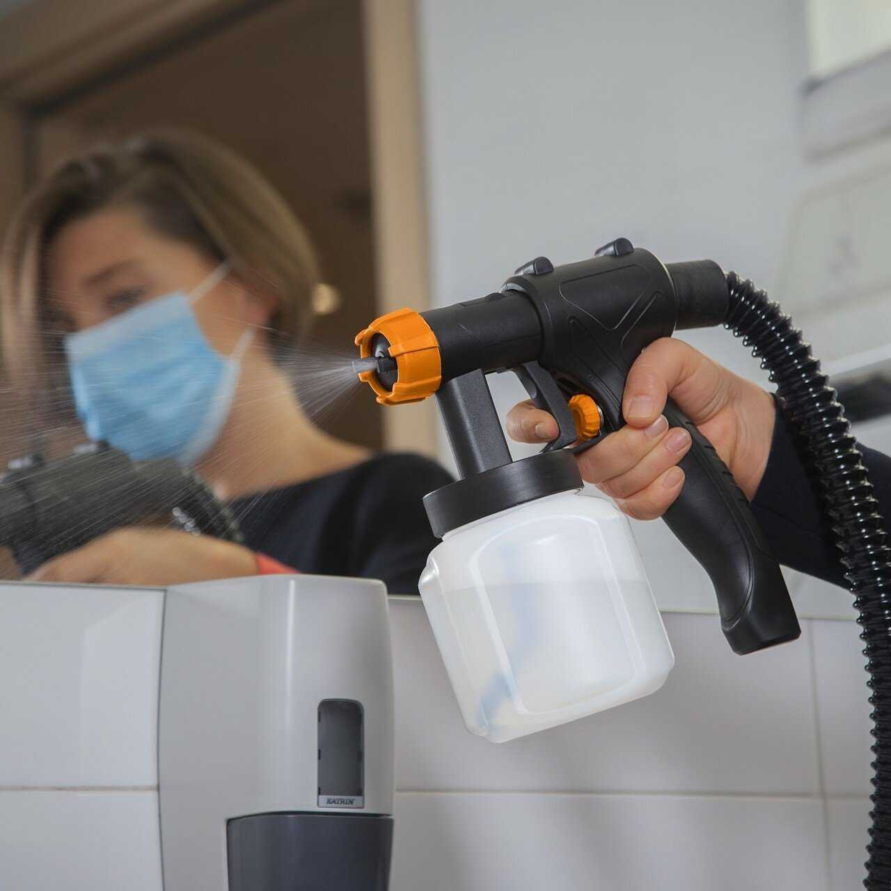 Первое время выскакивал шланг из компрессора и пистолета, вставил поплотнее, держится. Шумит как пылесос, сильно не напрягает. Распыленные капельки везде, но с валиком тоже их не избежать.