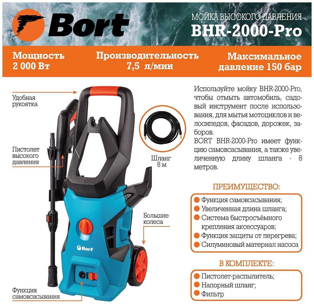 - Длинный армированный шланг высокого давления (8 м):