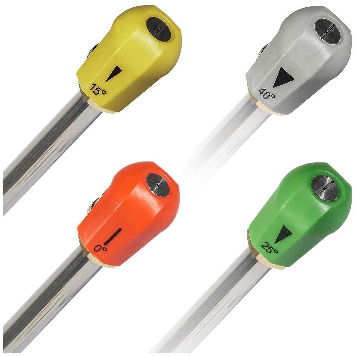 В комплект входят 4 форсунки (0°, 15°, 25°, 40°), но их качество неоднородно. Пользователи отмечают, что насадка на 25° оптимальна для кузова авто, а 0° справляется с бетоном или засохшей глиной. Однако у 40°-ной форсунки наблюдается неравномерный факел: края струи мощнее центра. Для сложных задач (например, отмывка силикатного кирпича) многие рекомендуют докупать специализированные насадки с другим сечением сопла. -