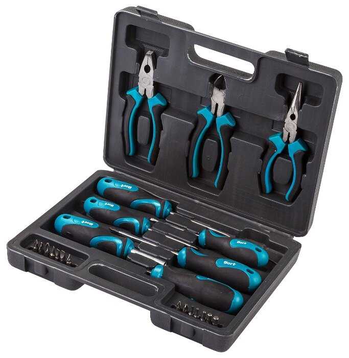 - Включает 23 предмета с отвертками, пассатижами, кусачками, головками и битами.