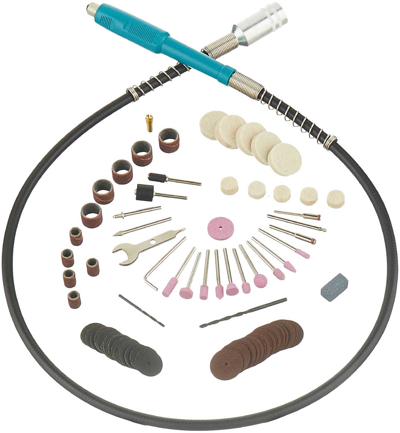 В комплекте идёт 40-60 насадок (фрезы, полировальные головки, отрезные диски), но их качество оценивается как посредственное. Особенно критикуют быстро забивающиеся абразивные насадки и хрупкие отрезные диски, которые разрушаются при нагрузке. При этом они совместимы со стандартами Dremel. -