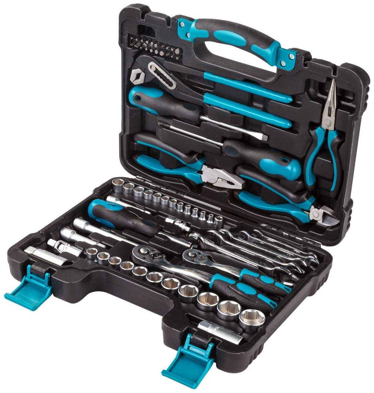 - Плотная упаковка инструментов внутри кейса предотвращает перемещение предметов во время транспортировки, обеспечивая сохранность и готовность к работе.