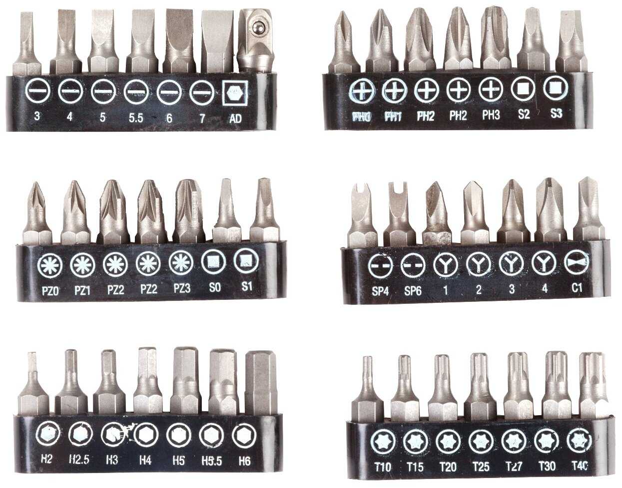 Биты подробно : | 25 мм: SL3, SL4, SL5, SL5.5, SL6, SL7, PH0, PH1, PH2, PH3, PZ0, PZ1, PZ2, PZ3, S0, S1, S2, S3, T10, T15, T20, T25, T27, T30, T40, H2, H2.5, H3, H4, H5, H5.5, H6, SP4, SP6, C1, TW1, TW2, TW3, TW4, AD |