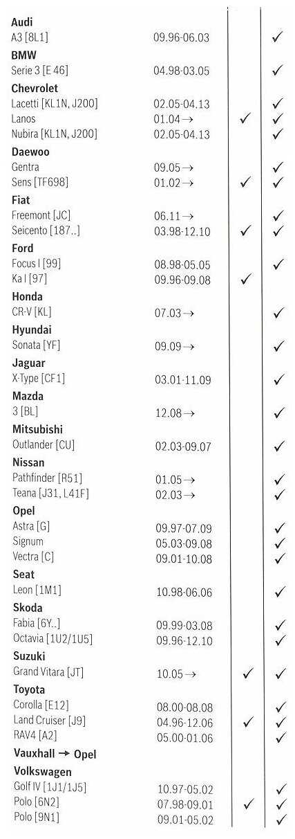 Abarth 124 Spider, Alfa Romeo 145, Alfa Romeo 146, Alfa Romeo 166, Audi A3, BMW 3 series, Chery Tiggo, Chevrolet Lacetti, Chevrolet Lanos, Chrysler 300, Citroen Saxo, Daewoo Gentra, Daewoo Leganza, Daihatsu Gran Move, Daihatsu Pyzar, Dodge Nitro, Fiat 124 Spider, Fiat Albea, Fiat Cinquecento, Fiat Croma, Fiat Freemont, Fiat Marea, Fiat Seicento, Fiat Siena, Fiat Stilo, Fiat Tipo, Ford Fiesta, Ford Focus, Ford Fusion, Ford Ka, Great Wall Hover, Honda Accord, Honda CR-V, Honda Civic, Honda Crosstour, Honda Legend, Honda Prelude, Kia Pregio, MG TF, Mazda 626, Mazda Capella, Mazda Eunos, Mazda MX-5, Mazda Tribute, Mazda Xedos, Mercury Montego, Mini Cooper, Mitsubishi Colt, Mitsubishi Eterna, Mitsubishi Galant, Mitsubishi L200, Mitsubishi Pajero, Nissan Almera, Nissan NP300, Nissan Navara, Nissan Patrol, Nissan Pick Up, Nissan Primera, Nissan Pulsar, Nissan Sunny, Nissan Teana, Nissan XTerra, Opel Astra, Opel Calibra, Opel Combo, Opel Frontera, Opel Omega, Opel Senator, Opel Signum, Opel Vectra, Renault Kadjar, Rover Montego, Seat Cordoba, Seat Ibiza, Skoda Fabia, Skoda Octavia, Smart Cabrio, SsangYong Kyron, Subaru Forester, Subaru Legacy, Subaru Libero, Suzuki Escudo, Suzuki Grand Vitara, Suzuki Grand Vitara XL7, Toyota Corolla, Toyota Fortuner, Toyota Hilux, Toyota Land Cruiser, Toyota Land Cruiser Prado, Toyota Mark II, Toyota SW4, Volkswagen Bora, Volkswagen Golf, Volkswagen Jetta, Volkswagen Lupo, Volkswagen Polo, Volvo 740