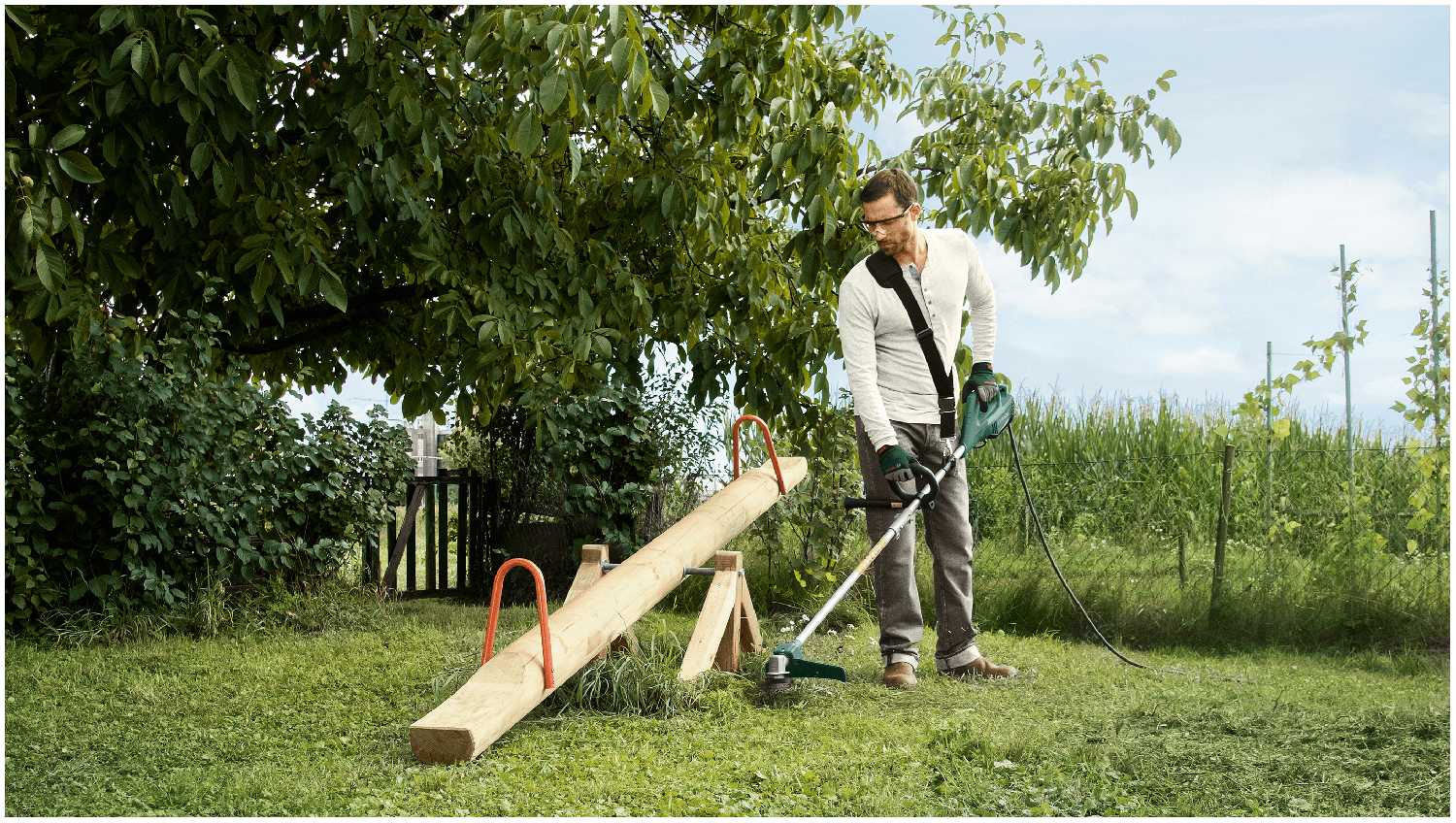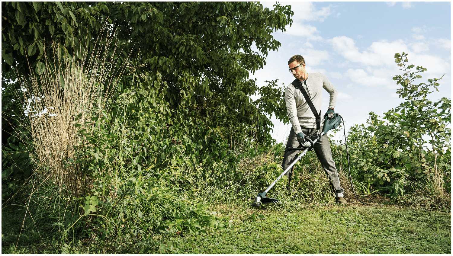 - Триммер справляется с густой травой, кустарником и молодыми побегами толщиной до 1–1,5 см благодаря двигателю мощностью 1000 Вт.