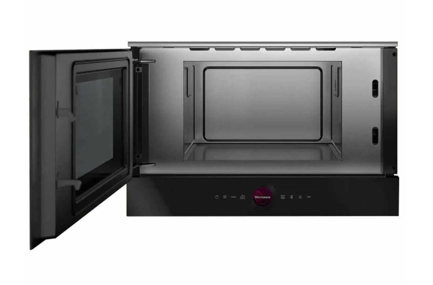 Объём большой для встраиваемой модели, позволяет ставить крупную посуду без столика. Дверца из закалённого стекла во всю ширину моется легко, камера доступна. Пользователи отмечают простоту ухода несмотря на глянец снаружи. В комплекте есть ключ для ножек. -