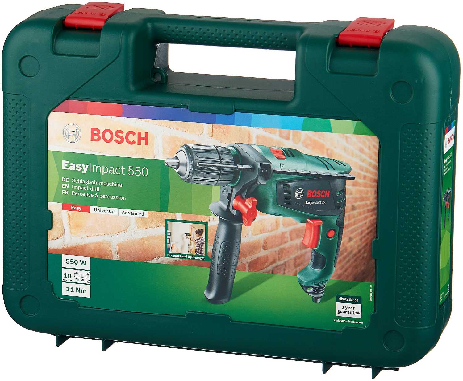 В комплект входит только дрель и пластиковый кейс. Отсутствие даже минимального набора бит и свёрл (особенно по бетону) — минус, их нужно покупать отдельно. Кейс вместителен, имеет ручку для переноски и место для аксессуаров, но отсутствие органайзеров внутри (для свёрл/бит) критикуют. По сравнению с бюджетными аналогами (например, "Интерскол") Bosch выигрывает в качестве сборки (нет люфтов, "виляния" сверла) и плавности хода. Однако для профессиональных задач или постоянной работы с бетоном пользователи рекомендуют специализированные перфораторы (Makita) или шуруповёрты, так как EasyImpact 550 — компромиссный, а не узкоспециализированный инструмент.