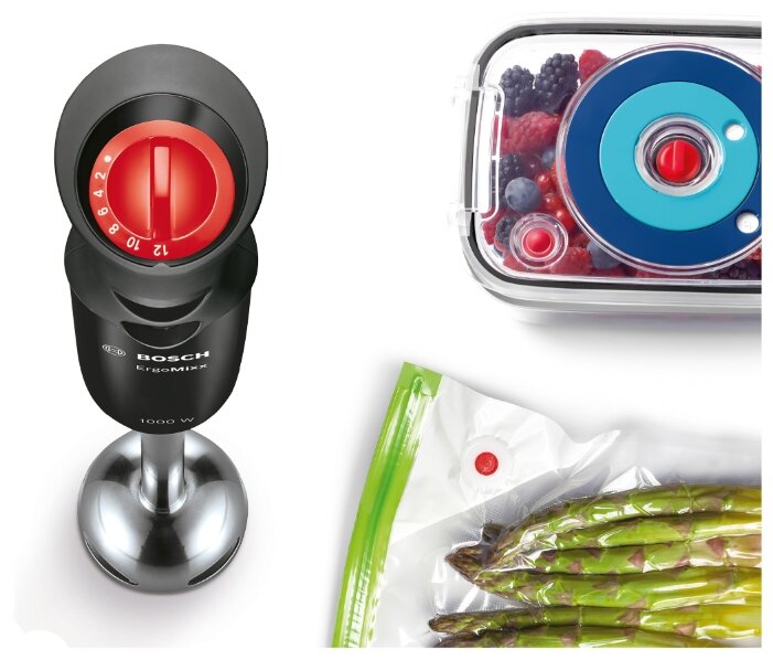 | Дополнительная информация : | функция вакуумирования в комплекте вакуумный насос вакуумный контейнер (10 л) вакуумные пакеты с замком (3х12 л и 3х38 л), ручка с покрытием Soft-touch, технология Bosch "QuattroBlade", низкий уровень шума и вибрации при работе мотора, удобная эргономичная ручка с мягким покрытием Soft-touch и большими кнопками, ножку из нержавеющей стали и аксессуары можно мыть в посудомоечной машине, венчик из нержавеющей стали |