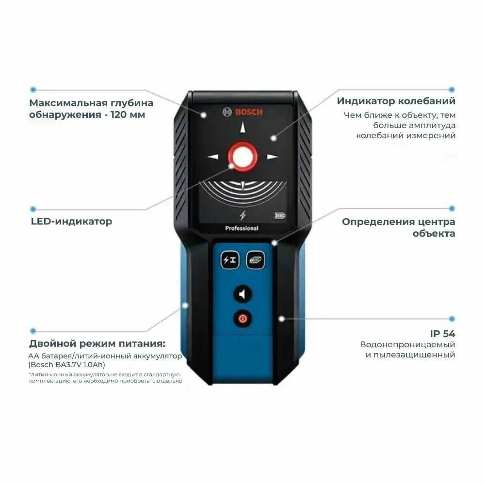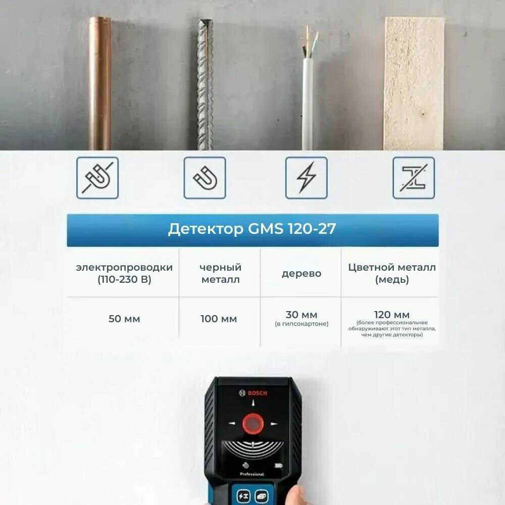 | Обнаруживаемые материалы : | деревянные конструкции, цветные металлы, черные металлы, электропроводка |