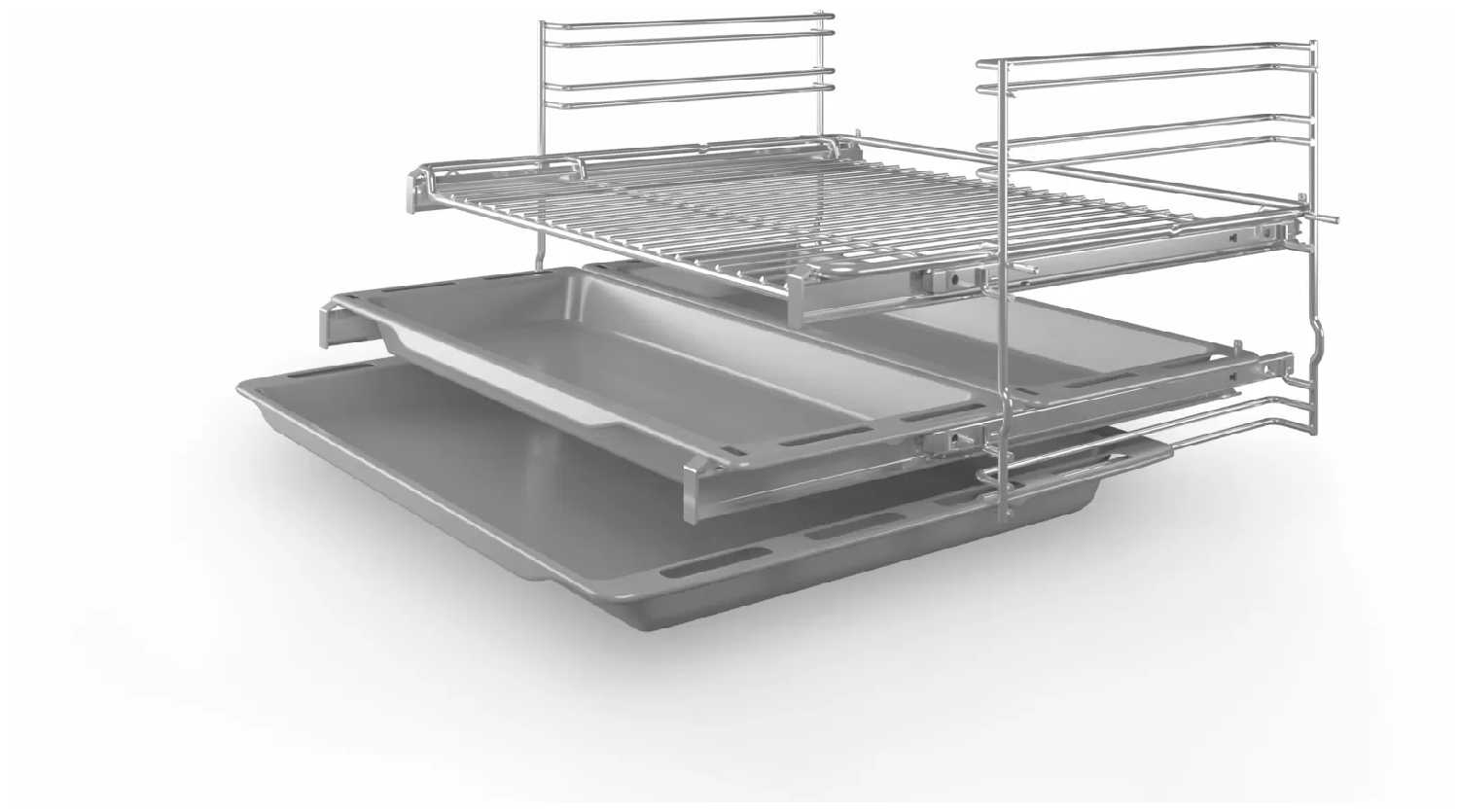 - + В духовке два комплекта выездных направляющих. Имеется емкость для воды, чтоб готовить с паром. Оптимальный набор противней.