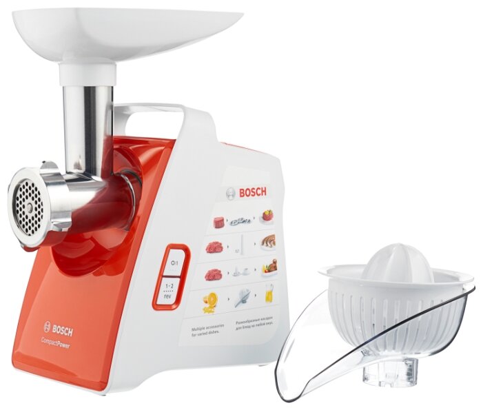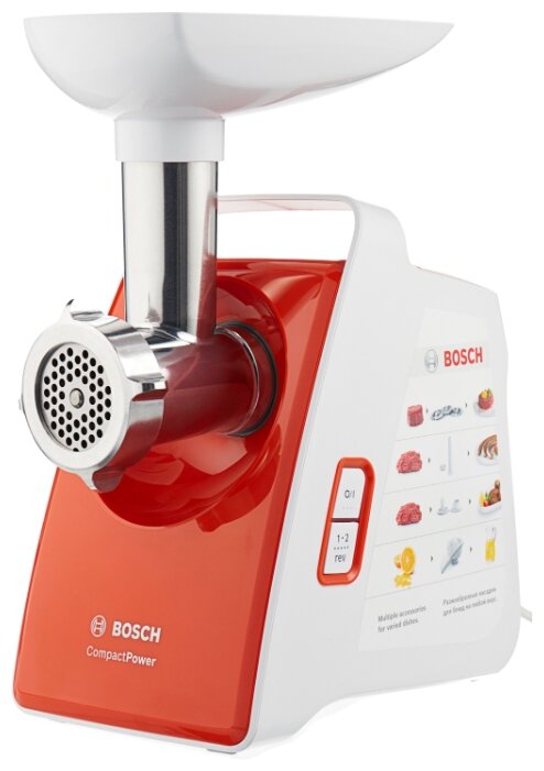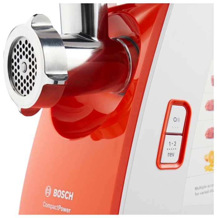 Достаточно компактный размер, наклейка Бош, количество дисков,хороший нож, крепкий пластиковый толкатель для мяса.