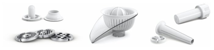 - + мясорубка очень классная: мощная, тихая, красивая! шнур собирается внутрь и некоторые насадки