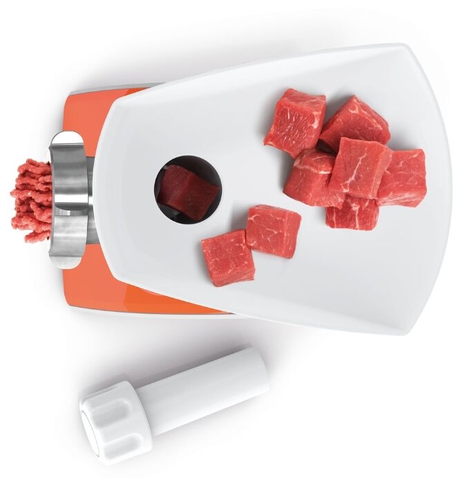 - Мощность двигателя (до 1600 Вт) позволяет перемалывать говядину с плёнками и свинину без предварительной заморозки.