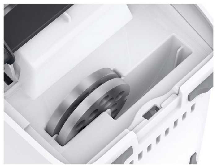 - + Шнур убирается в корпус мясорубки. Нож с двойной заточкой- можно ставить любой стороной. Отсек для хранения ножевых дисков.