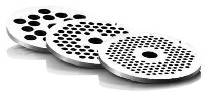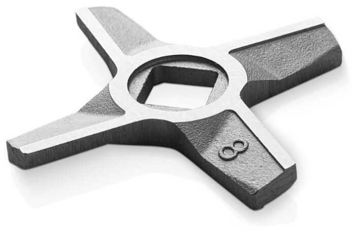 - Двусторонний нож с заточкой позволяет легко резать жилки, часто без использования реверса, обеспечивая однородный фарш без остатков на ноже.