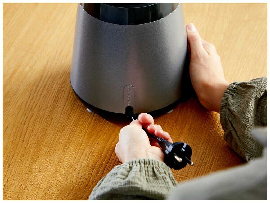 - Кабель прячется в корпус, а присоски фиксируют блендер на столе, предотвращая скольжение во время работы, что удобно для интенсивного использования.