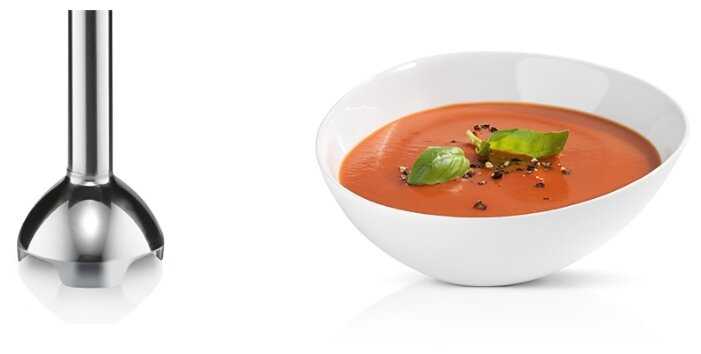 - Справляется с горячими супами-пюре, соусами и детским питанием без разбрызгивания благодаря продуманной форме ножки с антиразбрызгивающими рёбрами.
