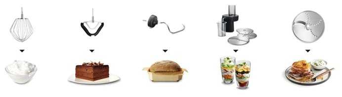 - + Простота использования. Много насадок. В перспективе можно приобрести дополнительные элементы (мясорубку или соковыжималку)