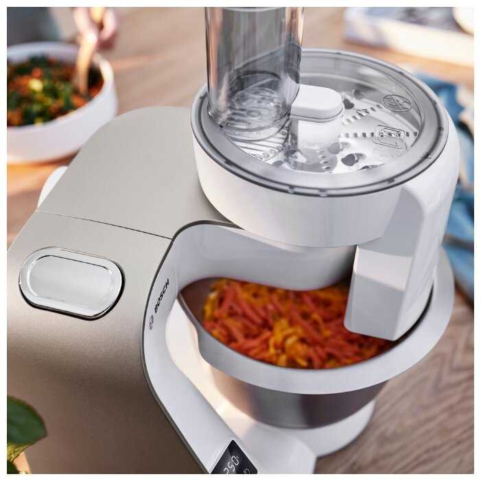 В комплекте есть насадки для шинковки и терки, можно также приобрести множество насадок для любых нужд. Встроенные весы огромный плюс, значительно ускоряют процесс и уменьшаю пространство для приготовления.