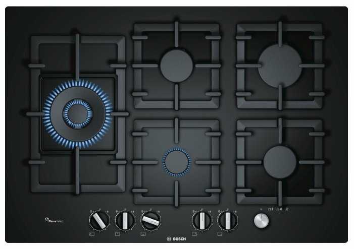 Пять решеток на прорезиненных держателях. Быстрый поджиг, отключение всех конфорок одним нажатием специальной кнопкой, двухконтурная конфорка сбоку, газ контроль всех конфорок.