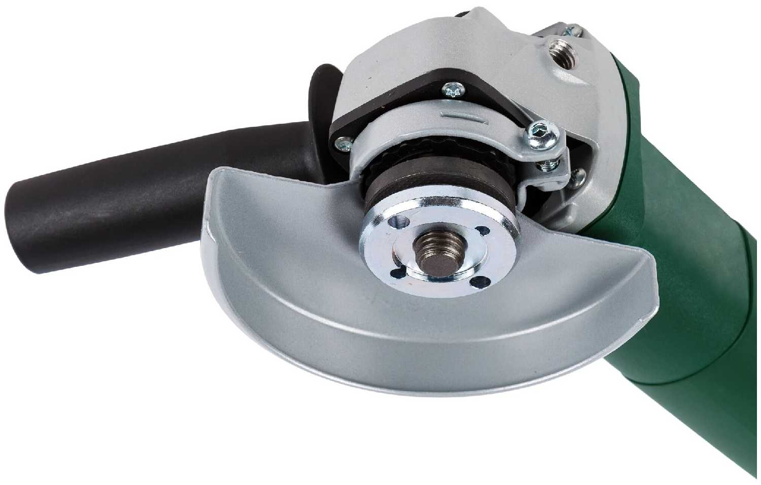 Защитный кожух фиксируется в 2–3 положениях с чёктым щелчком, но перестановка требует времени. Блокировки двигателя при заклинивании диска нет — это подтверждается в характеристиках. Искры при правильной установке кожуха не летят на оператора. Кнопка включения имеет надёжную фиксацию от случайного нажатия. -