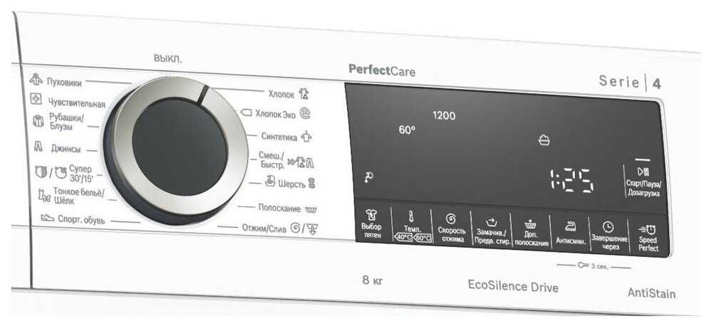 SpeedPerfect, PreSoaking для удаления сложных загрязнений, подавление дисбаланса при отжиме, двигатель - инверторный EcoSilenceDrive, барабан -