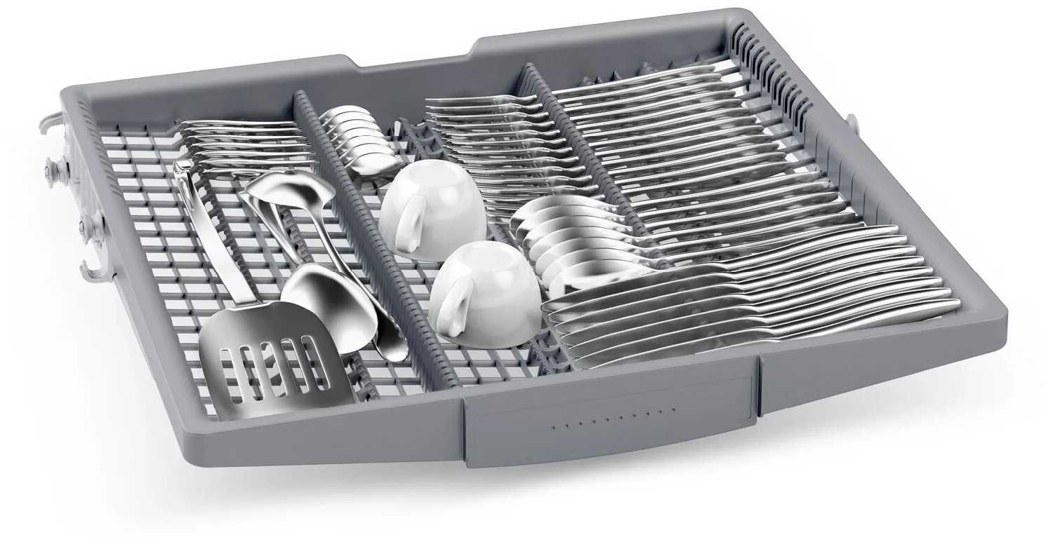 - + Третий верхний поддон, реально удобнее чем корзина. Более вместительная чем предыдущая, хотя заявлено на 1 комплект посуды меньше. Моет хорошо.