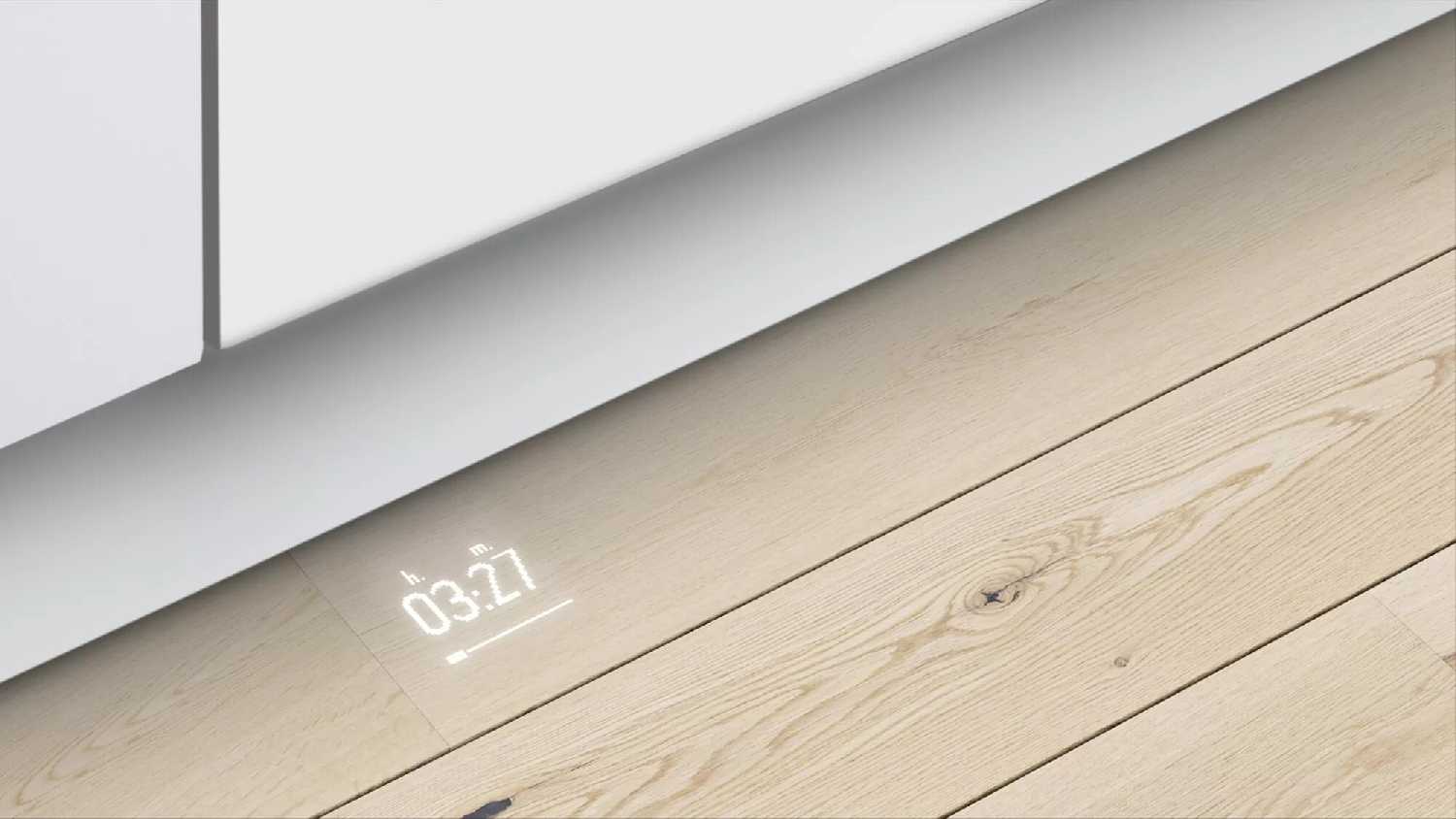 - Световая проекция времени до конца работы на пол позволяет отслеживать статус мойки без открывания дверцы, что особенно удобно в условиях фонового шума.