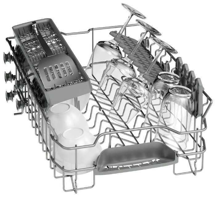 - + Очень тихо работает. Отмывает отлично! Достаточно посуды помещается. Есть доп.полочка для приборов.